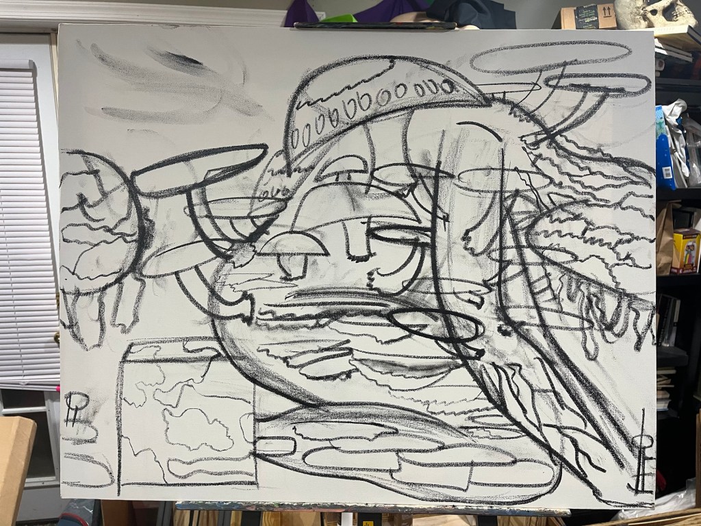 This work is still far from done. This is just some preliminary color. I might work on something else and let this dry completely before I go back with more paint. The underdrawing was done with wet charcoal and I had a time controlling the color because of this. I could have done it another way but chose the wet charcoal anyway. As a kind of experiment. Really my first time working with the wet charcoal. I inherited some quite a while ago from a friend who was moving away and getting rid of a ton of supplies. I may have even used some paint from that same encounter. Really unsure of that though, I have no idea what came from where anymore. It’s not that it’s such an abundance of supplies, but an underwhelming frequency of working with or even looking at the paint box.