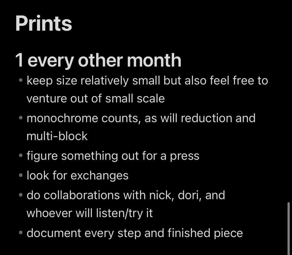 Printmaking is what my degree says I do. So I feel confidently obligated to make some prints every once in a while, that’s why it’s only every other month that I’m committing to a print. Any kind of print will do. I’ll probably be doing a bunch of relief prints because they’re able to be done without a press. But if I do figure out some sort of a press situation the. I’ll take advantage of it. Until then, it’s relief all the way. I’d like to get into a few exchanges as well. See what other people are up to and how they do it for real. Hopefully I’ll end up with some cool work too. Hell of a bonus.